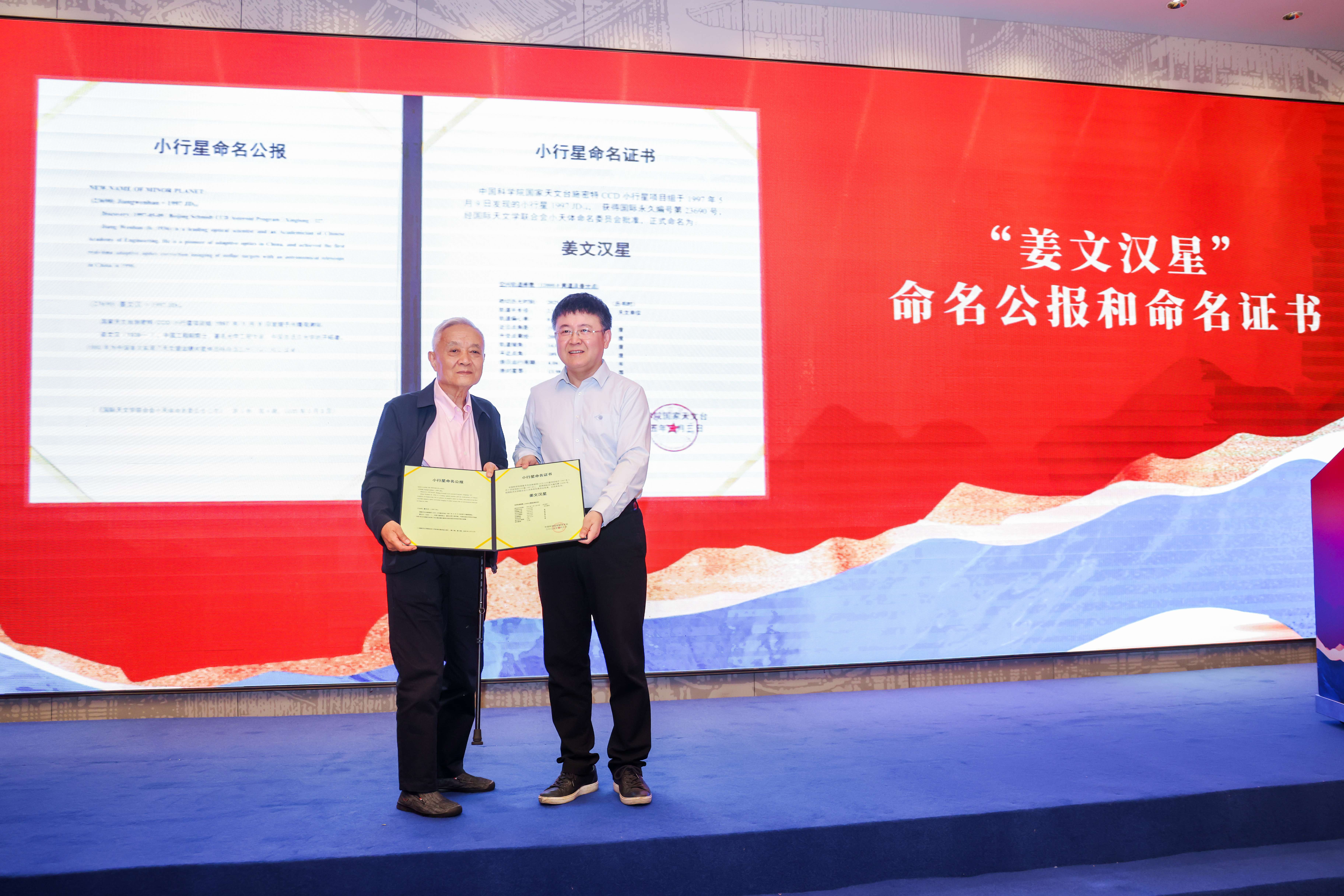 姜文汉院士是著名光学工程专家,我国自适应光学的开拓者和奠基人。1979年开辟自适应光学研究方向,1990年国内首次、世界第三个实现了天文望远镜自适应光学实时校正成像。会上宣读了“姜文汉星”命名公报和命名证书,颁授运行轨道图,并介绍了该小行星的发现过程。