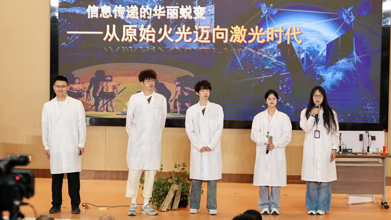 在科学实验展演环节,光电科普协会唐鸿洋等同学带来了《信息传递的华丽蜕变——从原始火光迈向激光时代》的科学实验展演,通过科学实验展演融合舞台剧的创新形式,让深奥的科学原理“活”起来,让抽象的知识“动”起来,把激光通信原理生动的展示给现场观众,让小朋友们感受到科学的趣味与魅力。